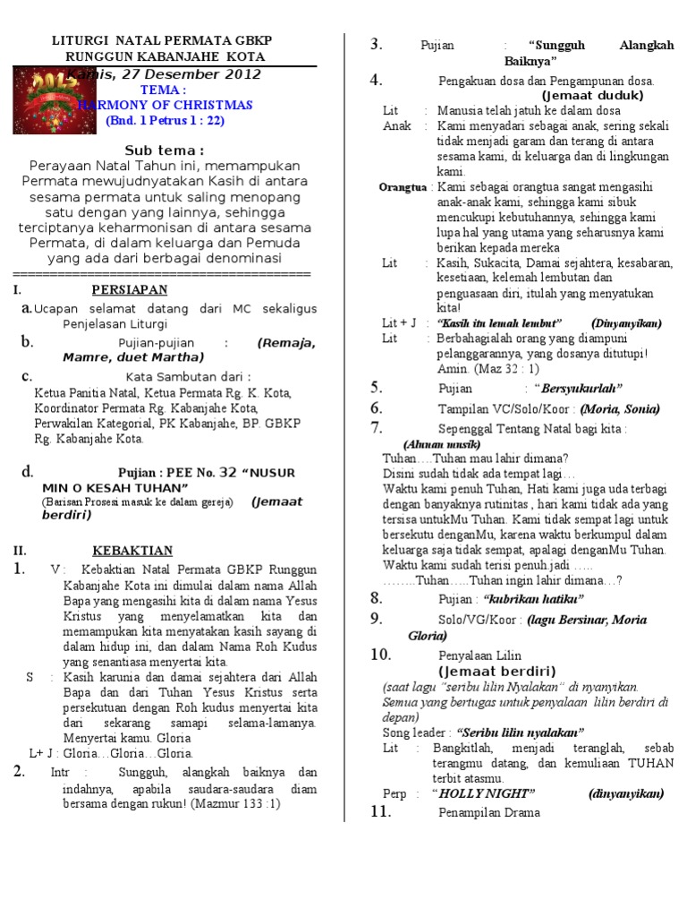 Saluhutna marhite hata i do umbahen na manjadi. Marilah kita berdoa untuk menyerahkan persembahan kepada tuhan iii. Bahan liturgi natal prolog liturgi i dimulana i nunga adong hatai, jala saor tu debata do hata i, jala debata do hata i, ima na soar tu debata dimulanai. Tertib acara natal nhkbp 2014 benar. Pada hari ini 25 desember 2011, merupakan puncak dari semua perayaan natal memperingati kelahiran sang juruselamat kita tuhan yesus kristus.